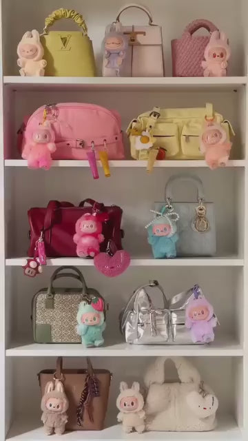 The set could include a miniature Labubu plushie with soft fur in light pink, baby blue, pale green, chocolate brown, cream, light gray, or beige. Each color mimics the pastel hue of a sweet macaroon. In addition, the plushie features a durable vinyl face and a key ring attachment. The key ring is crafted from gold-tone metal, and the ribbon attachment features “THE MONSTERS” in bold lettering.